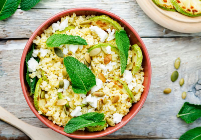 - Feta zerkleinern (schneiden oder bröseln) und mit den gegrillten Zucchini, Hirse und Kürbiskernen in eine Schüssel geben.