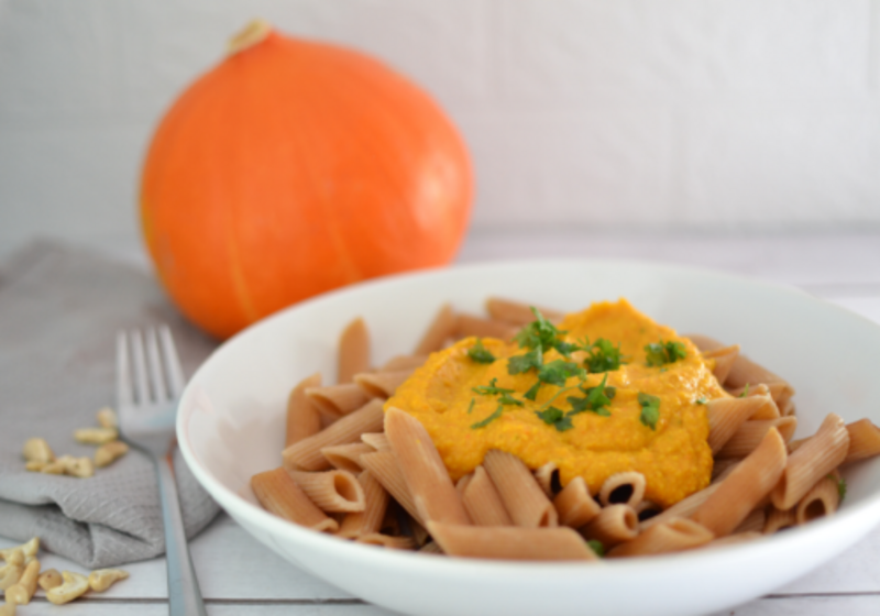 - Mit Gemüsebrühe ablöschen. Cashewkerne und Kürbispüree dazu geben und alles zu einer cremigen Masse pürieren. Sollte die Soße zu dick sein, kann noch etwas Wasser zugegeben werden. Zum Schluss Hefeflocken unterrühren und mit Salz und Pfeffer abschmecken.